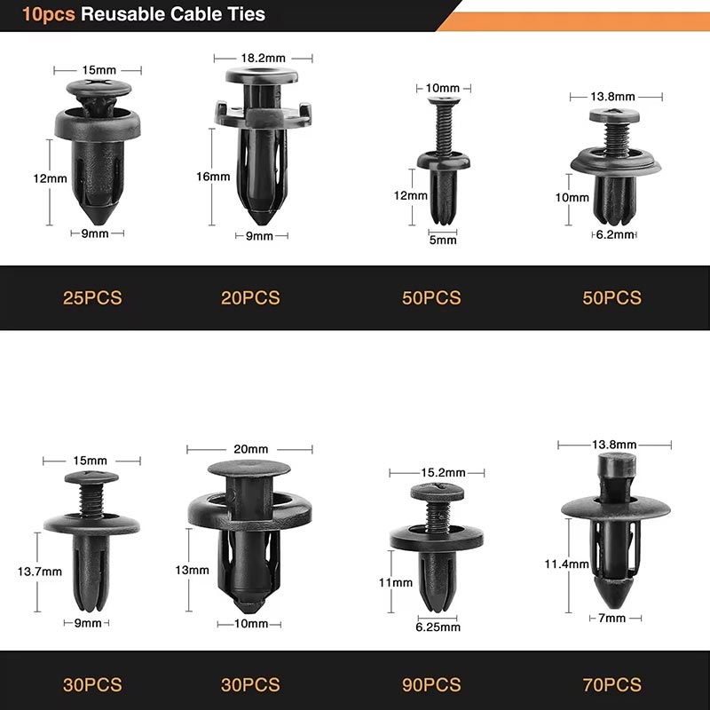 Nasz zestaw nylonowych klipsów do zderzaków samochodowych i błotników został stworzony, aby zapewnić niezawodne i bezpieczne rozwiązanie do różnych zastosowań motoryzacyjnych. Zestaw ten składa się z 635 sztuk wysokiej jakości nylonowych klipsów i jest dostępny w różnych rozmiarach i typach, co zapewnia wszechstronne pokrycie wszystkich potrzeb związanych z mocowaniem. Każdy klips został zaprojektowany tak, aby wytrzymać trudy codziennego użytkowania, zapewniając długotrwałą wydajność i trwałość.