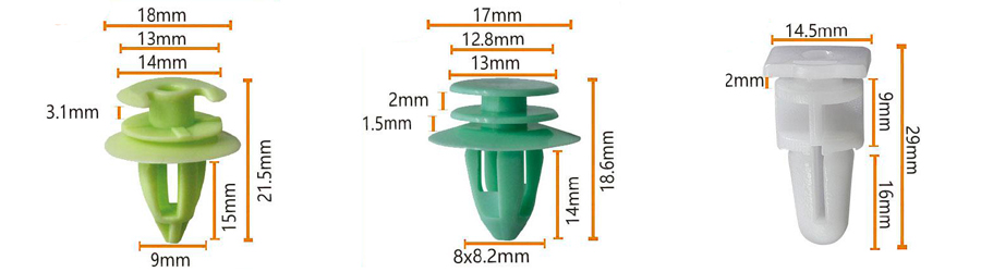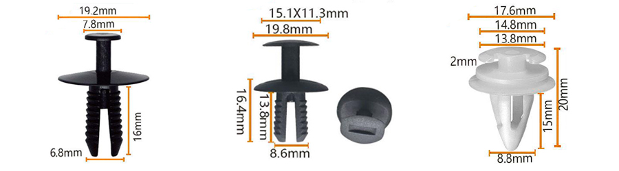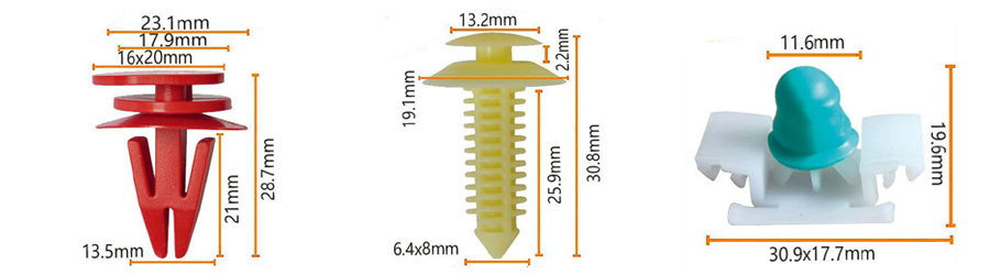 Plastikowe klipy szybkiego uwalniania: używane do ustawiania paneli nadwozia, zderzaków, wkładek do łuków kół i tak dalej. Te klipsy są zwykle wykonane z opornych na wysokiej temperatury, wysokiej wytrzymałości tworzyw sztucznych i są zaprojektowane z funkcją szybkiego uwalniania, co ułatwia naprawa lub wymiana części.