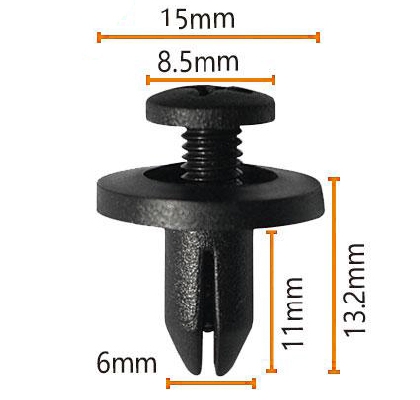 Średnica głowy tego mocowania wynosi 15 mm, całkowitą wysokość wynosi 13,2 mm, szerokość dna wynosi 8,5 mm, długość śruby wynosi 11 mm.